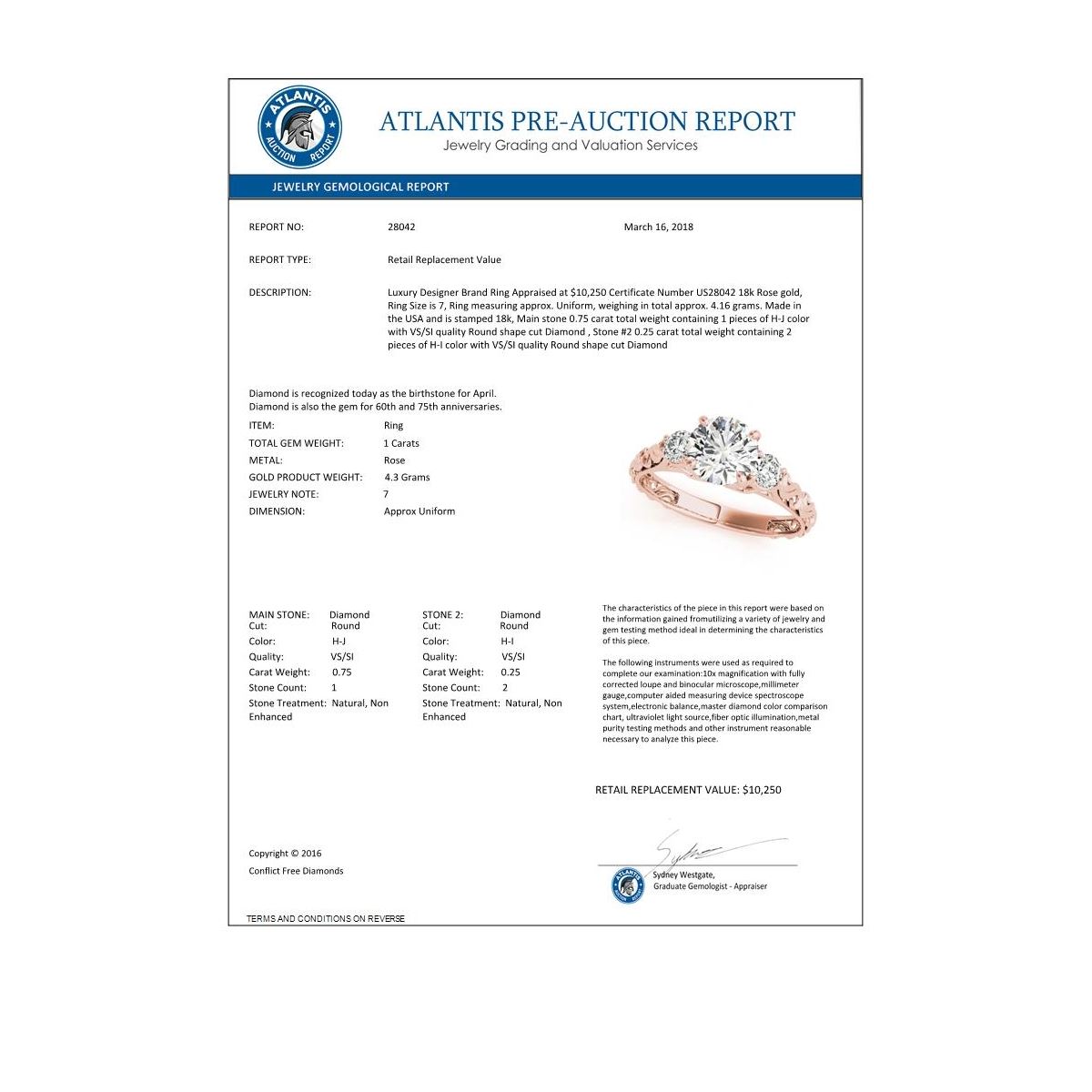 REF-186X4T -28042 ---- 1 CTW Certified VS/SI Diamond 3 Stone Solitaire Ring 18K Rose Gold ---- Luxury Designer Brand Ring Appraised at $10,250 Certificate Number US28042 18k Rose gold, Ring Size is 7, Ring measuring approx. Uniform, weighing in total approx. 4.16 grams. Made in the USA and is stamped 18k, Main stone 0.75 carat total weight containing 1 pieces of H-J color with VS/SI quality Round shape cut Diamond , Stone #2 0.25 carat total weight containing 2 pieces of H-I color with VS/SI quality Round shape cut Diamond