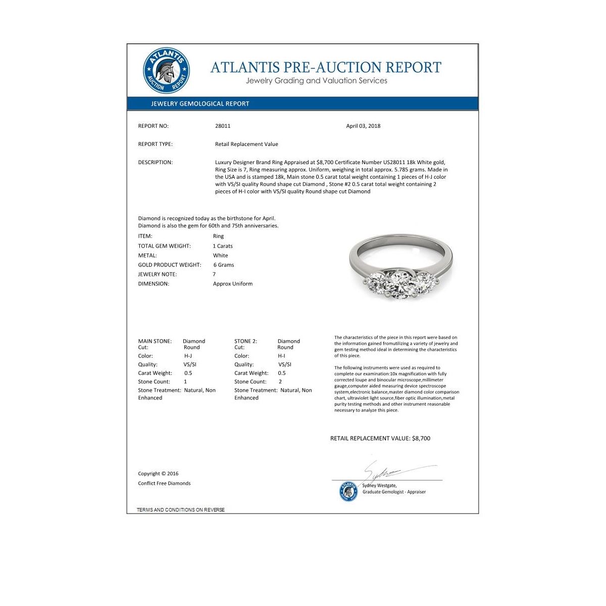 REF-158H4A -28011 ---- 1 CTW Certified VS/SI Diamond 3 Stone Solitaire Ring 18K White Gold ---- Luxury Designer Brand Ring Appraised at $8,700 Certificate Number US28011 18k White gold, Ring Size is 7, Ring measuring approx. Uniform, weighing in total approx. 5.785 grams. Made in the USA and is stamped 18k, Main stone 0.5 carat total weight containing 1 pieces of H-J color with VS/SI quality Round shape cut Diamond , Stone #2 0.5 carat total weight containing 2 pieces of H-I color with VS/SI quality Round shape cut Diamond