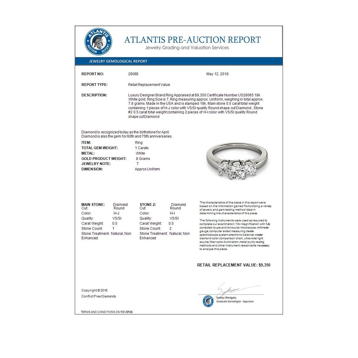 REF-170T2M -28065 ---- 1 CTW Certified VS/SI Diamond 3 Stone Solitaire Ring 18K White Gold ---- Luxury Designer Brand Ring Appraised at $9,350 Certificate Number US28065 18k White gold, Ring Size is 7, Ring measuring approx. Uniform, weighing in total approx. 7.8 grams. Made in the USA and is stamped 18k, Main stone 0.5 carat total weight containing 1 pieces of H-J color with VS/SI quality Round shape cut Diamond , Stone #2 0.5 carat total weight containing 2 pieces of H-I color with VS/SI quality Round shape cut Diamond