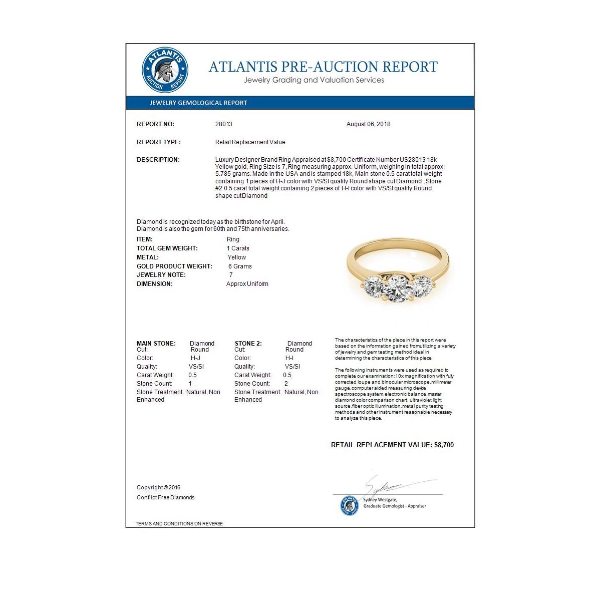 REF-158T4M -28013 ---- 1 CTW Certified VS/SI Diamond 3 Stone Solitaire Ring 18K Yellow Gold ---- Luxury Designer Brand Ring Appraised at $8,700 Certificate Number US28013 18k Yellow gold, Ring Size is 7, Ring measuring approx. Uniform, weighing in total approx. 5.785 grams. Made in the USA and is stamped 18k, Main stone 0.5 carat total weight containing 1 pieces of H-J color with VS/SI quality Round shape cut Diamond , Stone #2 0.5 carat total weight containing 2 pieces of H-I color with VS/SI quality Round shape cut Diamond