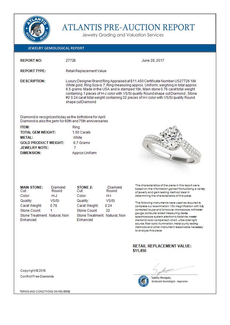 1 CTW Certified VS/SI Diamond Bypass Solitaire Ring 18K White Gold ---- Luxury Designer Brand Ring Appraised Retail Price at $11,450 ---- SKU Number US27726 18k White gold Ring Size is 7, Ring measuring approx. Uniform, weighing in total approx. 6.5 grams. Made in the USA and is stamped 18k, Main stone 0.76 carat total weight containing 1 pieces of H-J color with VS/SI quality Round shape cut Diamond , Stone #2 0.24 carat total weight containing 32 pieces of H-I color with VS/SI quality Round shape cut