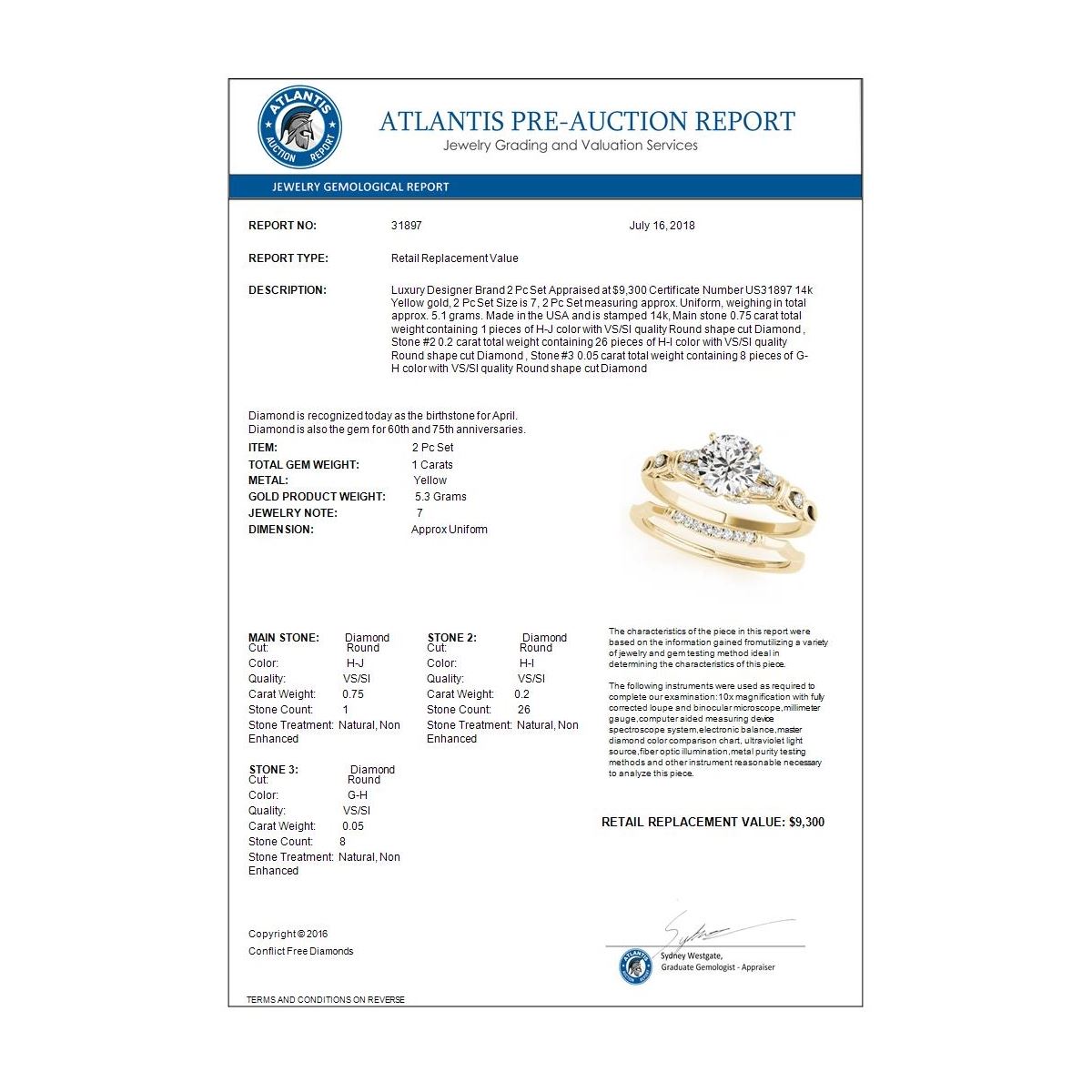 REF-187A5X -31897 ---- 1 CTW Certified VS/SI Diamond Solitaire 2Pc Wedding Set 14K Yellow Gold ---- Luxury Designer Brand 2 Pc Set Appraised at $9,300 Certificate Number US31897 14k Yellow gold, 2 Pc Set Size is 7, 2 Pc Set measuring approx. Uniform, weighing in total approx. 5.1 grams. Made in the USA and is stamped 14k, Main stone 0.75 carat total weight containing 1 pieces of H-J color with VS/SI quality Round shape cut Diamond , Stone #2 0.2 carat total weight containing 26 pieces of H-I color with VS/SI quality Round shape cut Diamond , Stone #3 0.05 carat total weight containing 8 pieces of G-H color with VS/SI quality Round shape cut Diamond