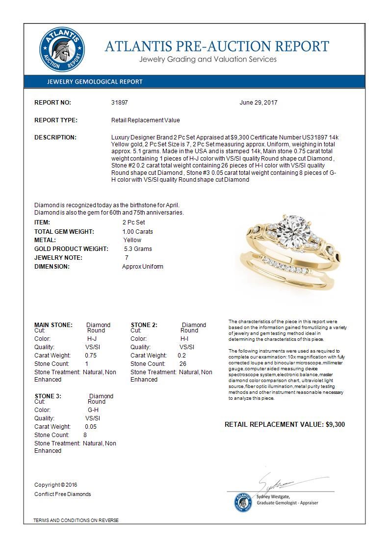 1 CTW Certified VS/SI Diamond Solitaire 2Pc Wedding Set 14K Yellow Gold ---- Luxury Designer Brand 2 Pc Set Appraised Retail Price at $9,300 ---- SKU Number US31897 14k Yellow gold 2 Pc Set Size is 7, 2 Pc Set measuring approx. Uniform, weighing in total approx. 5.1 grams. Made in the USA and is stamped 14k, Main stone 0.75 carat total weight containing 1 pieces of H-J color with VS/SI quality Round shape cut Diamond , Stone #2 0.2 carat total weight containing 26 pieces of H-I color with VS/SI quality Round shape cut