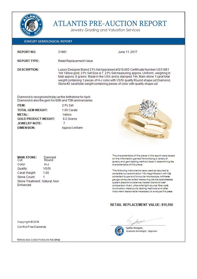 1 CTW Certified VS/SI Diamond Solitaire 2Pc Wedding Set 14K Yellow Gold ---- Luxury Designer Brand 2 Pc Set Appraised Retail Price at $19,950 ---- SKU Number US31861 14k Yellow gold 2 Pc Set Size is 7, 2 Pc Set measuring approx. Uniform, weighing in total approx. 8 grams. Made in the USA and is stamped 14k, Main stone 1.00 carat total weight containing 1 pieces of H-J color with VS/SI quality Round shape cut Diamond , Stone #2 carat total weight containing pieces of color with quality shape cut