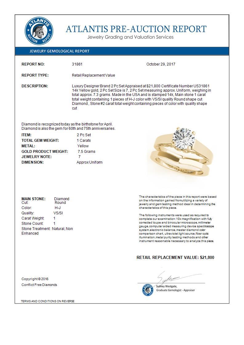 REF-396H4A -31861 ---- 1 CTW Certified VS/SI Diamond Solitaire 2Pc Wedding Set 14K Yellow Gold ---- Luxury Designer Brand 2 Pc Set Appraised at $21,800 Certificate Number US31861 14k Yellow gold, 2 Pc Set Size is 7, 2 Pc Set measuring approx. Uniform, weighing in total approx. 7.3 grams. Made in the USA and is stamped 14k, Main stone 1 carat total weight containing 1 pieces of H-J color with VS/SI quality Round shape cut Diamond , Stone #2 carat total weight containing pieces of color with quality shape cut