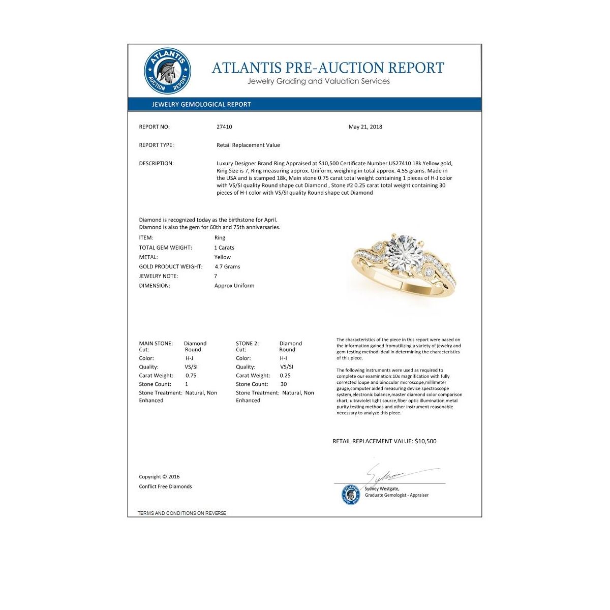 REF-191H3A -27410 ---- 1 CTW Certified VS/SI Diamond Solitaire Antique Ring 18K Yellow Gold ---- Luxury Designer Brand Ring Appraised at $10,500 Certificate Number US27410 18k Yellow gold, Ring Size is 7, Ring measuring approx. Uniform, weighing in total approx. 4.55 grams. Made in the USA and is stamped 18k, Main stone 0.75 carat total weight containing 1 pieces of H-J color with VS/SI quality Round shape cut Diamond , Stone #2 0.25 carat total weight containing 30 pieces of H-I color with VS/SI quality Round shape cut Diamond