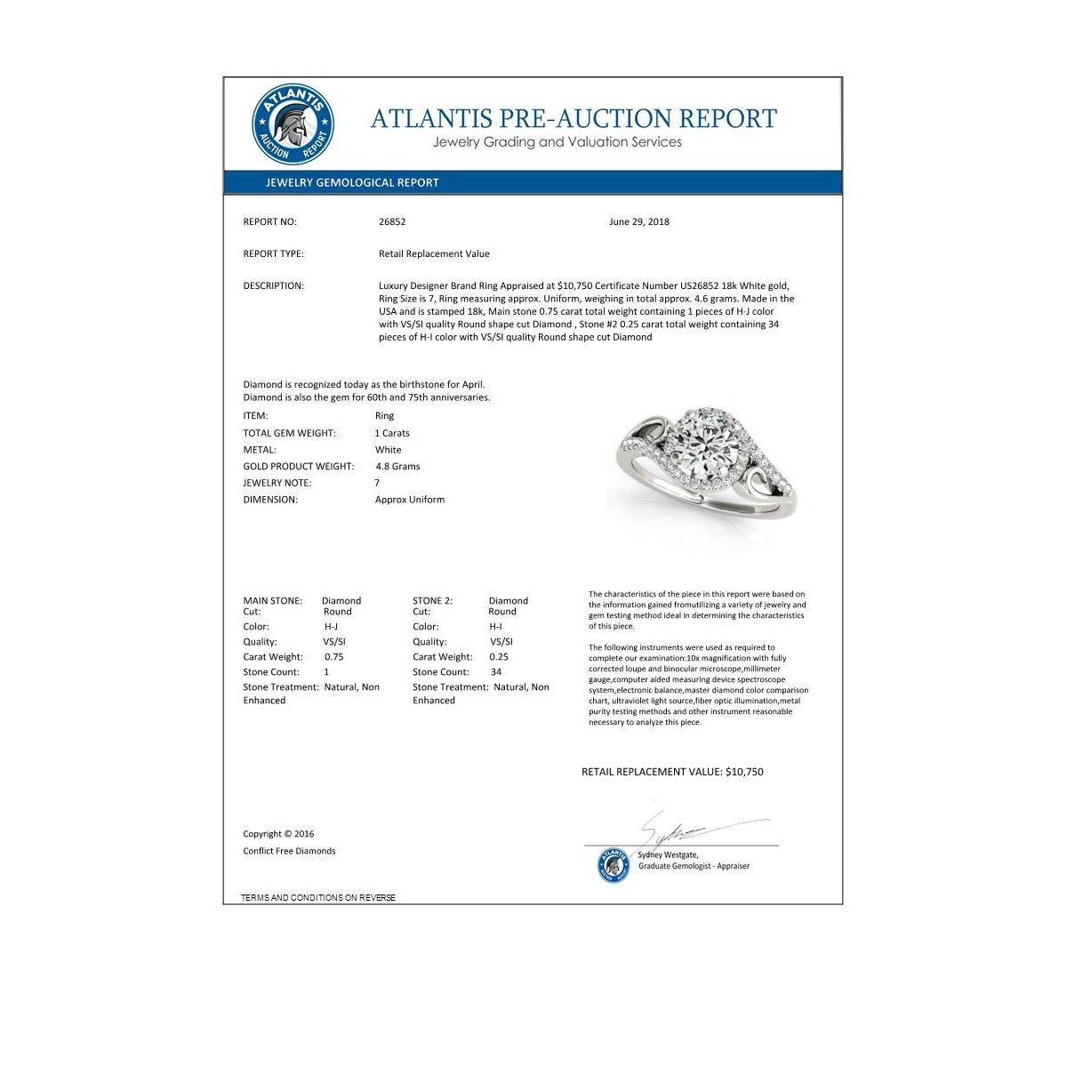 REF-195F3N -26852 ---- 1 CTW Certified VS/SI Diamond Solitaire Halo Ring 18K White Gold ---- Luxury Designer Brand Ring Appraised at $10,750 Certificate Number US26852 18k White gold, Ring Size is 7, Ring measuring approx. Uniform, weighing in total approx. 4.6 grams. Made in the USA and is stamped 18k, Main stone 0.75 carat total weight containing 1 pieces of H-J color with VS/SI quality Round shape cut Diamond , Stone #2 0.25 carat total weight containing 34 pieces of H-I color with VS/SI quality Round shape cut Diamond
