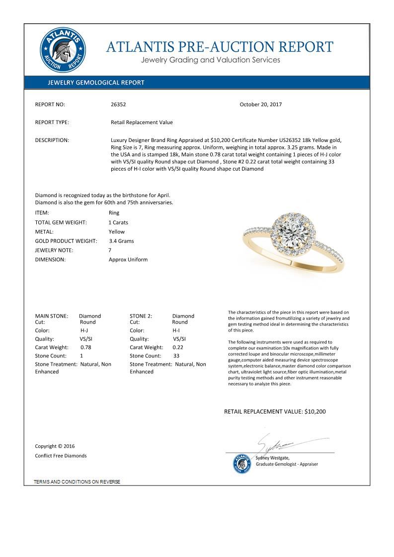 26352 - REF-185Y3X ---- 1 CTW Certified VS/SI Diamond Solitaire Halo Ring 18K Yellow Gold ---- Luxury Designer Brand Ring Appraised at $10,200 Certificate Number US26352  18k Yellow gold,  Ring Size is 7, Ring measuring approx. Uniform, weighing in total approx. 3.25 grams. Made in the USA and is stamped 18k, Main stone 0.78 carat total weight containing 1 pieces of H-J color with VS/SI quality Round shape cut Diamond , Stone #2 0.22 carat total weight containing 33 pieces of H-I color with  VS/SI quality Round shape cut Diamond