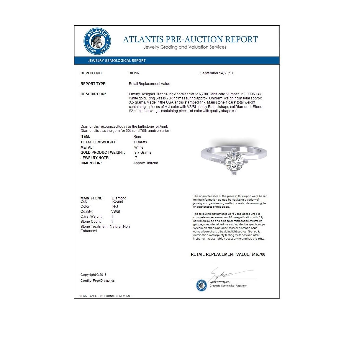 REF-278H3A -30396 ---- 1 CTW Certified VS/SI Diamond Solitaire Ring 14K White Gold ---- Luxury Designer Brand Ring Appraised at $16,700 Certificate Number US30396 14k White gold, Ring Size is 7, Ring measuring approx. Uniform, weighing in total approx. 3.5 grams. Made in the USA and is stamped 14k, Main stone 1 carat total weight containing 1 pieces of H-J color with VS/SI quality Round shape cut Diamond , Stone #2 carat total weight containing pieces of color with quality shape cut