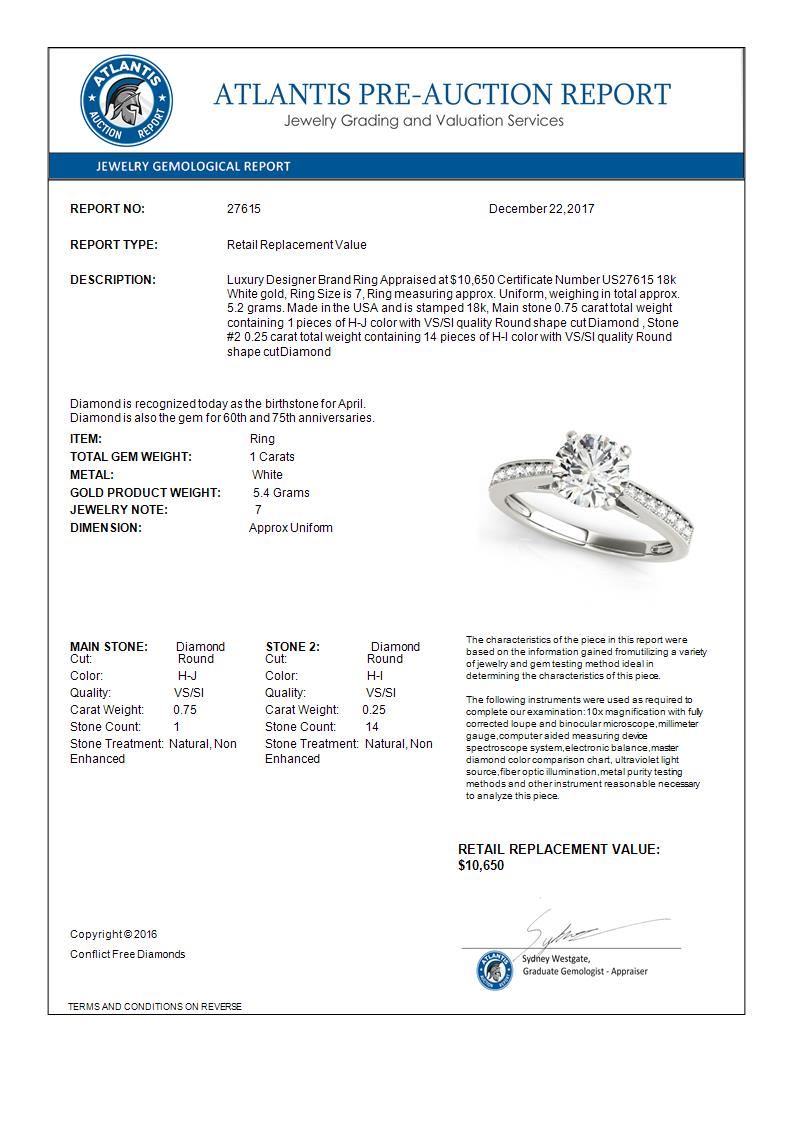 REF-193H3A -27615 ---- 1 CTW Certified VS/SI Diamond Solitaire Ring 18K White Gold ---- Luxury Designer Brand Ring Appraised at $10,650 Certificate Number US27615 18k White gold, Ring Size is 7, Ring measuring approx. Uniform, weighing in total approx. 5.2 grams. Made in the USA and is stamped 18k, Main stone 0.75 carat total weight containing 1 pieces of H-J color with VS/SI quality Round shape cut Diamond , Stone #2 0.25 carat total weight containing 14 pieces of H-I color with VS/SI quality Round shape cut Diamond