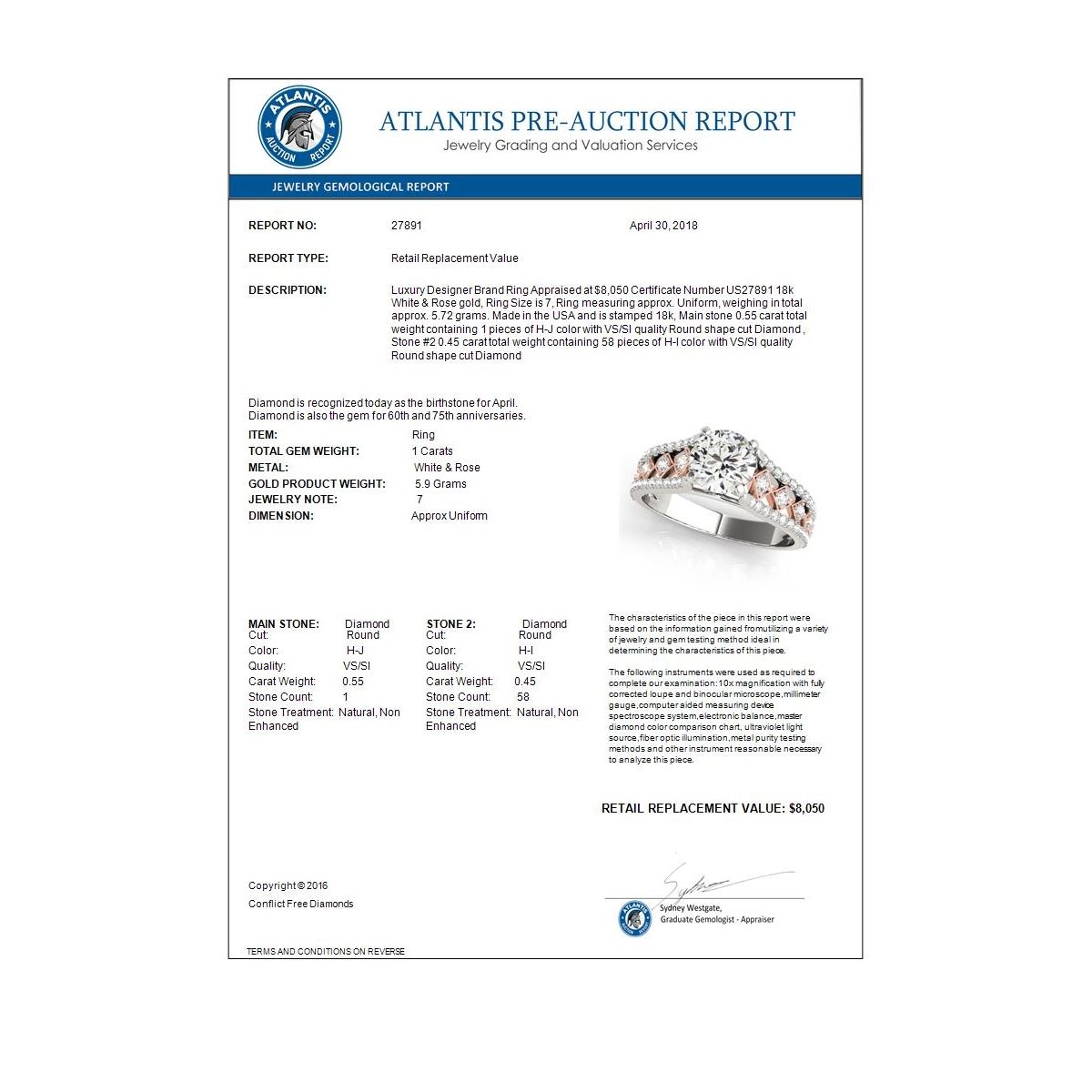 REF-146W4F -27891 ---- 1 CTW Certified VS/SI Diamond Solitaire Ring 18K White & Rose Gold ---- Luxury Designer Brand Ring Appraised at $8,050 Certificate Number US27891 18k White & Rose gold, Ring Size is 7, Ring measuring approx. Uniform, weighing in total approx. 5.72 grams. Made in the USA and is stamped 18k, Main stone 0.55 carat total weight containing 1 pieces of H-J color with VS/SI quality Round shape cut Diamond , Stone #2 0.45 carat total weight containing 58 pieces of H-I color with VS/SI quality Round shape cut Diamond