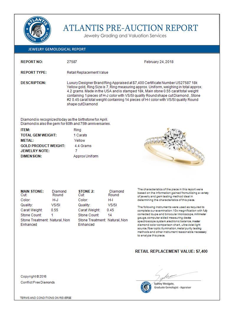 REF-149M3H -27587 ---- 1 CTW Certified VS/SI Diamond Solitaire Ring 18K Yellow Gold ---- Luxury Designer Brand Ring Appraised at $7,400 Certificate Number US27587 18k Yellow gold, Ring Size is 7, Ring measuring approx. Uniform, weighing in total approx. 4.2 grams. Made in the USA and is stamped 18k, Main stone 0.55 carat total weight containing 1 pieces of H-J color with VS/SI quality Round shape cut Diamond , Stone #2 0.45 carat total weight containing 14 pieces of H-I color with VS/SI quality Round shape cut Diamond