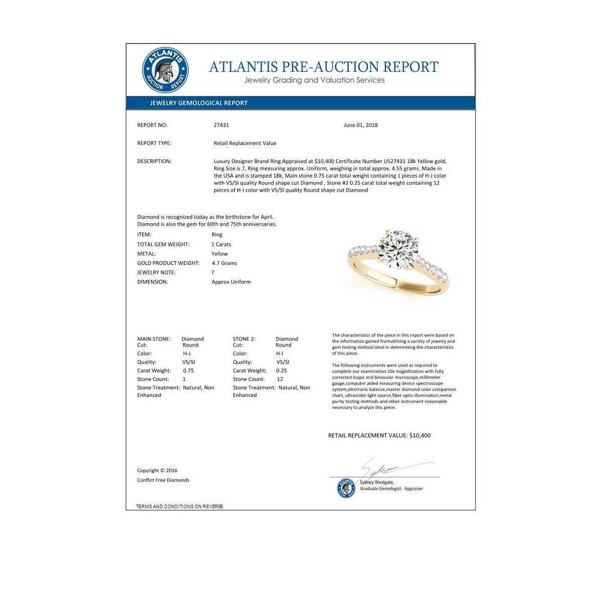 REF-189T3M -27431 ---- 1 CTW Certified VS/SI Diamond Solitaire Ring 18K Yellow Gold ---- Luxury Designer Brand Ring Appraised at $10,400 Certificate Number US27431 18k Yellow gold, Ring Size is 7, Ring measuring approx. Uniform, weighing in total approx. 4.55 grams. Made in the USA and is stamped 18k, Main stone 0.75 carat total weight containing 1 pieces of H-J color with VS/SI quality Round shape cut Diamond , Stone #2 0.25 carat total weight containing 12 pieces of H-I color with VS/SI quality Round shape cut Diamond