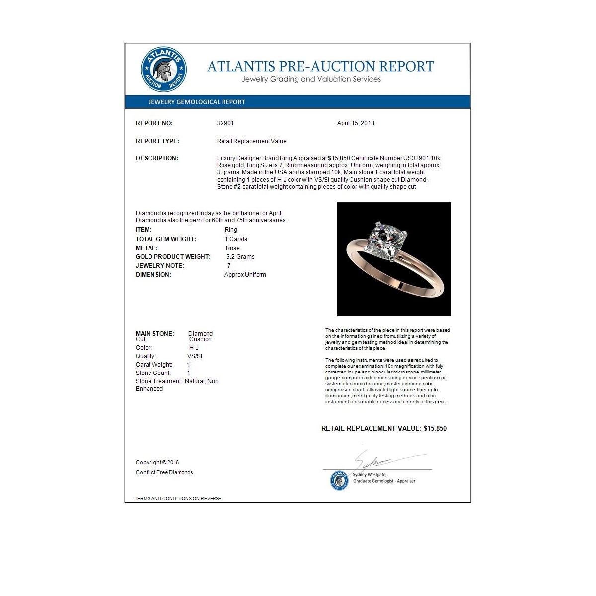 REF-297W2F -32901 ---- 1 CTW Certified VS/SI Quality Cushion Cut Diamond Solitaire Ring 10K Rose Gold ---- Luxury Designer Brand Ring Appraised at $15,850 Certificate Number US32901 10k Rose gold, Ring Size is 7, Ring measuring approx. Uniform, weighing in total approx. 3 grams. Made in the USA and is stamped 10k, Main stone 1 carat total weight containing 1 pieces of H-J color with VS/SI quality Cushion shape cut Diamond , Stone #2 carat total weight containing pieces of color with quality shape cut