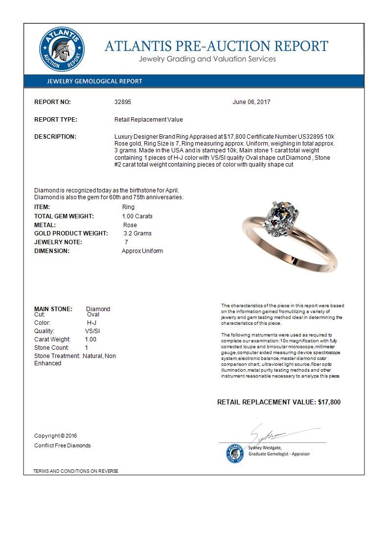 1 CTW Certified VS/SI Quality Oval Diamond Solitaire Ring 10K Rose Gold ---- Luxury Designer Brand Ring Appraised Retail Price at $17,800 ---- SKU Number US32895 10k Rose gold Ring Size is 7, Ring measuring approx. Uniform, weighing in total approx. 3 grams. Made in the USA and is stamped 10k, Main stone 1.00 carat total weight containing 1 pieces of H-J color with VS/SI quality Oval shape cut Diamond , Stone #2 carat total weight containing pieces of color with quality shape cut