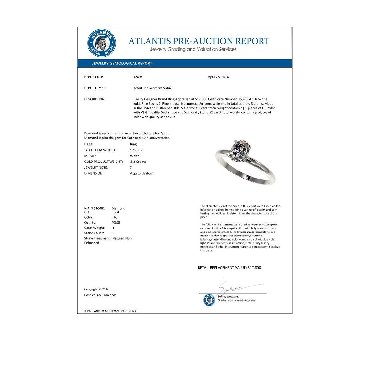 REF-297X2T -32894 ---- 1 CTW Certified VS/SI Quality Oval Diamond Solitaire Ring 10K White Gold ---- Luxury Designer Brand Ring Appraised at $17,800 Certificate Number US32894 10k White gold, Ring Size is 7, Ring measuring approx. Uniform, weighing in total approx. 3 grams. Made in the USA and is stamped 10k, Main stone 1 carat total weight containing 1 pieces of H-J color with VS/SI quality Oval shape cut Diamond , Stone #2 carat total weight containing pieces of color with quality shape cut