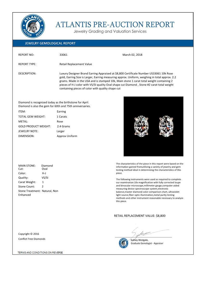 REF-147W2F -33061 ---- 1 CTW Certified VS/SI Quality Oval Diamond Solitaire Stud Earrings 10K Rose Gold ---- Luxury Designer Brand Earring Appraised at $8,800 Certificate Number US33061 10k Rose gold, Earring Size is Larger, Earring measuring approx. Uniform, weighing in total approx. 2.2 grams. Made in the USA and is stamped 10k, Main stone 1 carat total weight containing 2 pieces of H-J color with VS/SI quality Oval shape cut Diamond , Stone #2 carat total weight containing pieces of color with quality shape cut