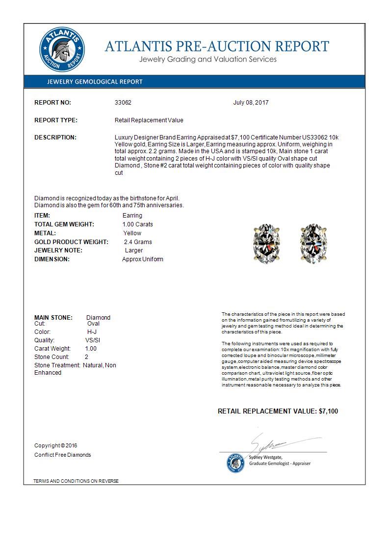 1 CTW Certified VS/SI Quality Oval Diamond Solitaire Stud Earrings 10K Yellow Gold ---- Luxury Designer Brand Earring Appraised Retail Price at $7,100 ---- SKU Number US33062 10k Yellow gold Earring Size is Larger, Earring measuring approx. Uniform, weighing in total approx. 2.2 grams. Made in the USA and is stamped 10k, Main stone 1.00 carat total weight containing 2 pieces of H-J color with VS/SI quality Oval shape cut Diamond , Stone #2 carat total weight containing pieces of color with quality shape cut
