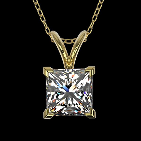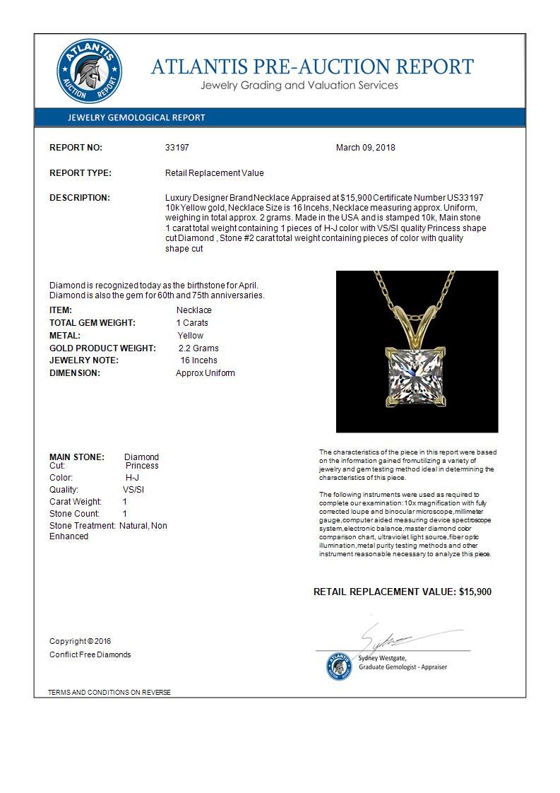 REF-265W3F -33197 ---- 1 CTW Certified VS/SI Quality Princess Diamond Solitaire Necklace 10K Yellow Gold ---- Luxury Designer Brand Necklace Appraised at $15,900 Certificate Number US33197 10k Yellow gold, Necklace Size is 16 Incehs, Necklace measuring approx. Uniform, weighing in total approx. 2 grams. Made in the USA and is stamped 10k, Main stone 1 carat total weight containing 1 pieces of H-J color with VS/SI quality Princess shape cut Diamond , Stone #2 carat total weight containing pieces of color with quality shape cut