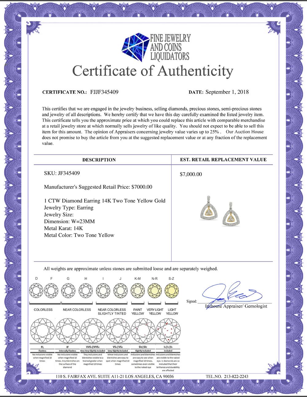 REF-90Y8X - JF345409 ---- 1 CTW White Round Diamond Earring 14K Two Tone Yellow Gold