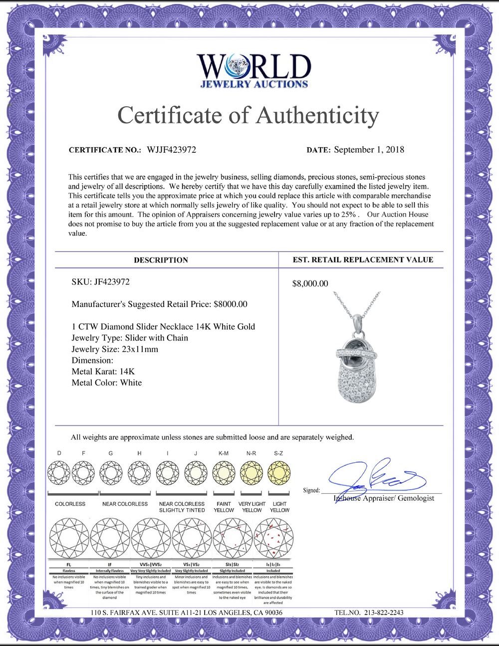 All property is sold “AS IS”, and ALL SALES ARE FINAL. Property is open to thorough public inspection. It is the Bidder’s responsibility to determine condition, age, genuineness, value or any other determinative factor. WJA may attempt to describe the merchandise in advertising and on the Internet but makes no representations. In no event shall WORLD JEWELRY AUCTION be held responsible for having made or implied any warranty of merchantability or fitness for a particular purpose. Bidder shall be the sole judge of value.