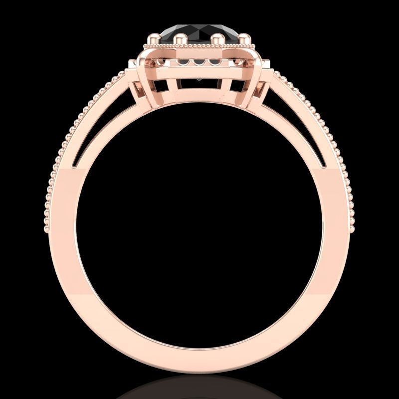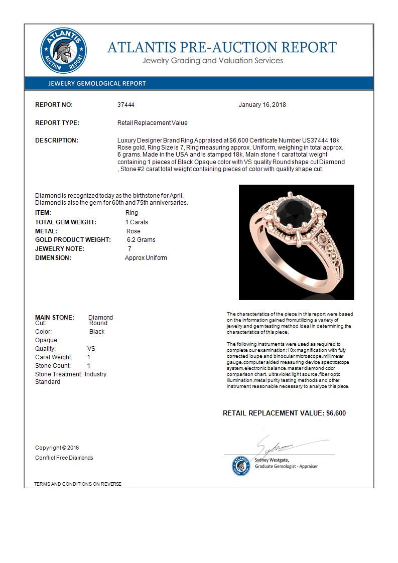 REF-100F2N -37444 ---- 1 CTW Fancy Black Diamond Solitaire Engagement Art Deco Ring 18K Rose Gold ---- Luxury Designer Brand Ring Appraised at $6,600 Certificate Number US37444 18k Rose gold, Ring Size is 7, Ring measuring approx. Uniform, weighing in total approx. 6 grams. Made in the USA and is stamped 18k, Main stone 1 carat total weight containing 1 pieces of Black Opaque color with VS quality Round shape cut Diamond , Stone #2 carat total weight containing pieces of color with quality shape cut