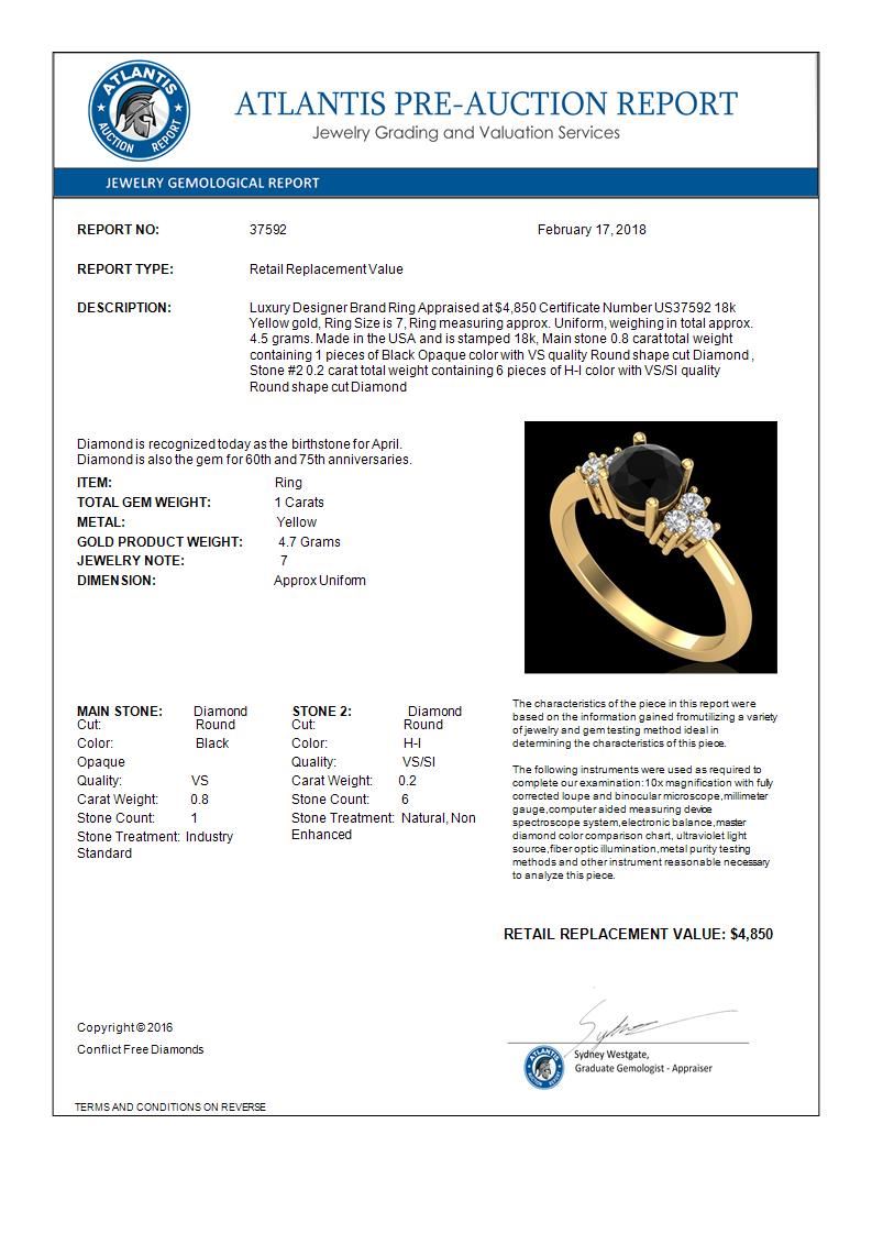REF-80A2X -37592 ---- 1 CTW Fancy Black Diamond Solitaire Engagement Classic Ring 18K Yellow Gold ---- Luxury Designer Brand Ring Appraised at $4,850 Certificate Number US37592 18k Yellow gold, Ring Size is 7, Ring measuring approx. Uniform, weighing in total approx. 4.5 grams. Made in the USA and is stamped 18k, Main stone 0.8 carat total weight containing 1 pieces of Black Opaque color with VS quality Round shape cut Diamond , Stone #2 0.2 carat total weight containing 6 pieces of H-I color with VS/SI quality Round shape cut Diamond