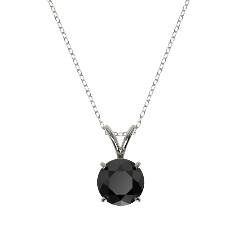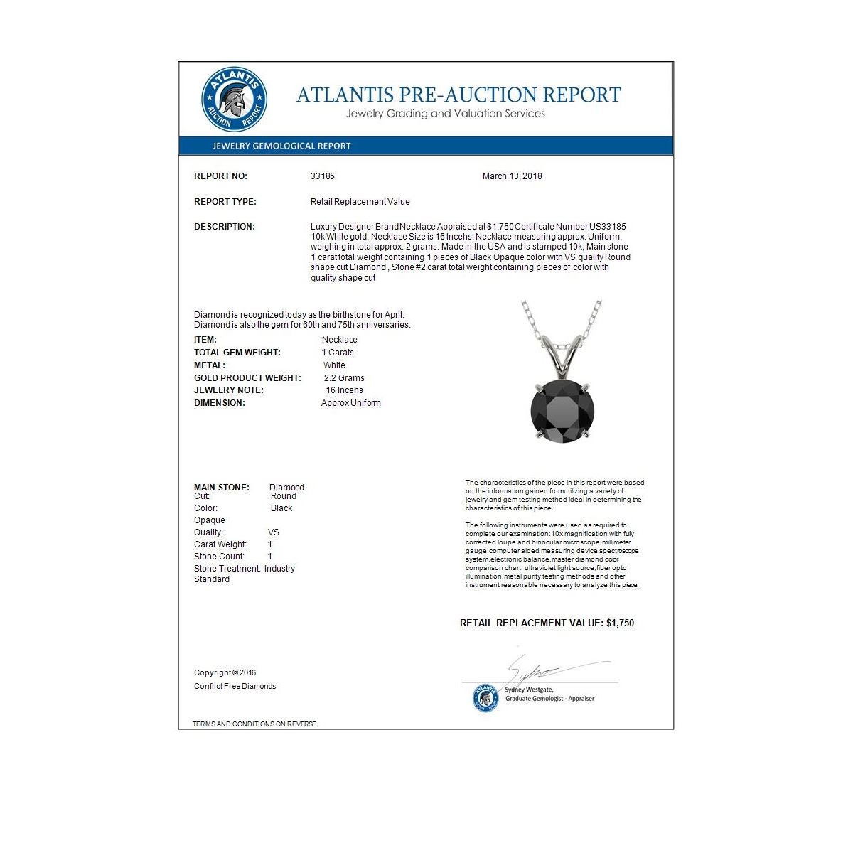 REF-26W3F -33185 ---- 1 CTW Fancy Black VS Diamond Solitaire Necklace 10K White Gold ---- Luxury Designer Brand Necklace Appraised at $1,750 Certificate Number US33185 10k White gold, Necklace Size is 16 Incehs, Necklace measuring approx. Uniform, weighing in total approx. 2 grams. Made in the USA and is stamped 10k, Main stone 1 carat total weight containing 1 pieces of Black Opaque color with VS quality Round shape cut Diamond , Stone #2 carat total weight containing pieces of color with quality shape cut