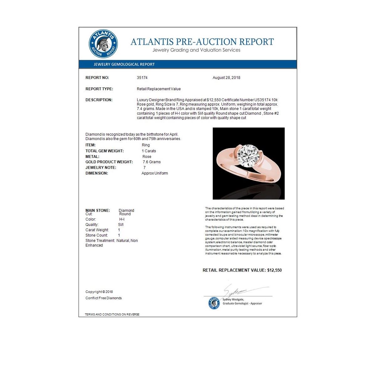 REF-207W3F -35174 ---- 1 CTW H-SI/I Certified Diamond Solitaire Ring 10K Rose Gold ---- Luxury Designer Brand Ring Appraised at $12,550 Certificate Number US35174 10k Rose gold, Ring Size is 7, Ring measuring approx. Uniform, weighing in total approx. 7.4 grams. Made in the USA and is stamped 10k, Main stone 1 carat total weight containing 1 pieces of H-I color with SI/I quality Round shape cut Diamond , Stone #2 carat total weight containing pieces of color with quality shape cut