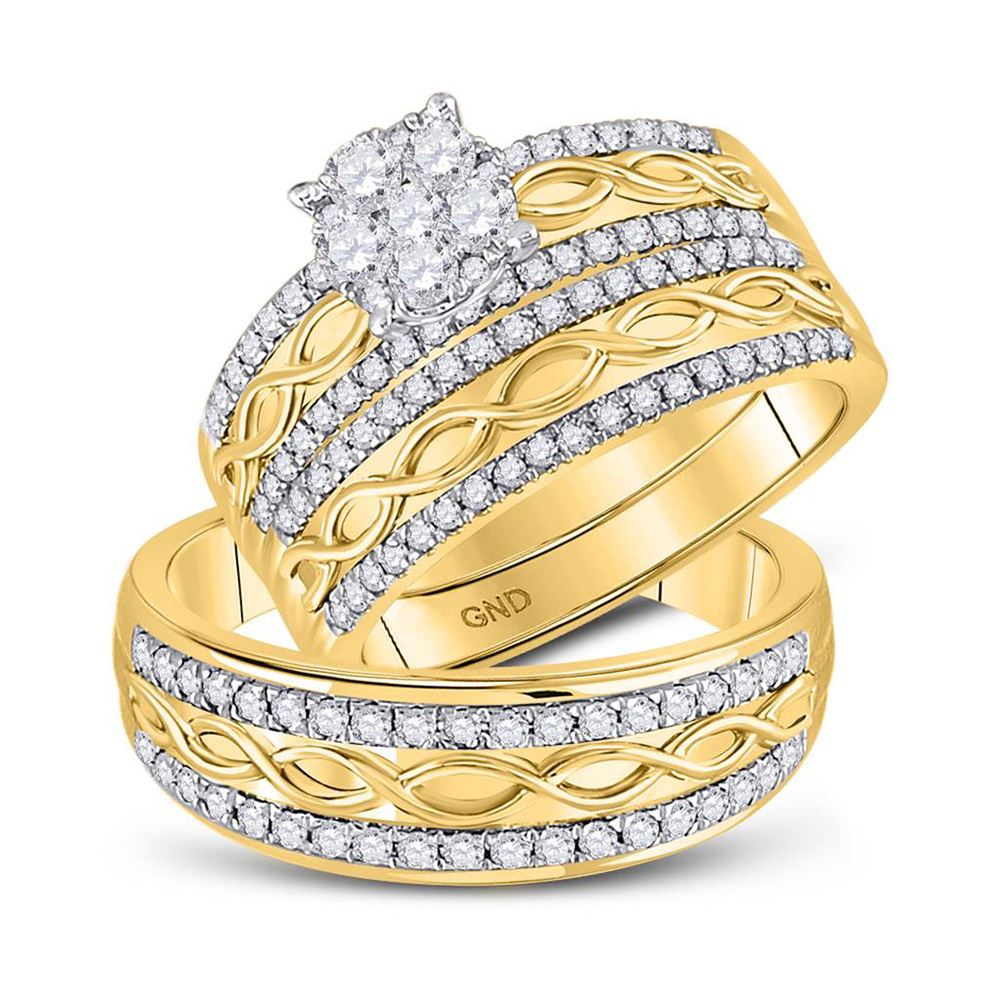 REF-105F7W - 1 CTW His Hers Round Diamond Cluster Matching Wedding Set 10kt Yellow Gold - REF-105F7W