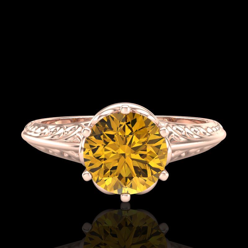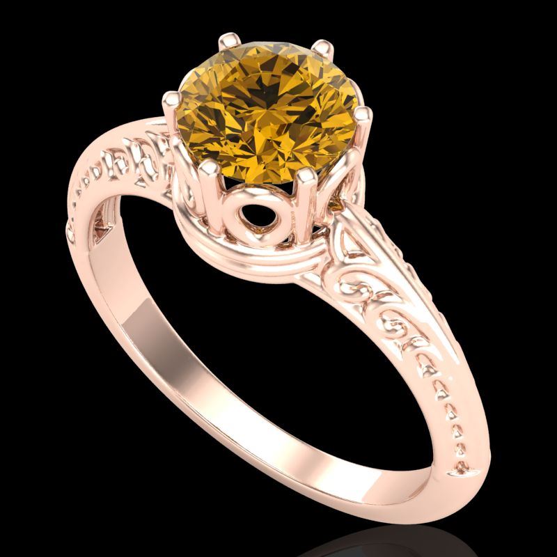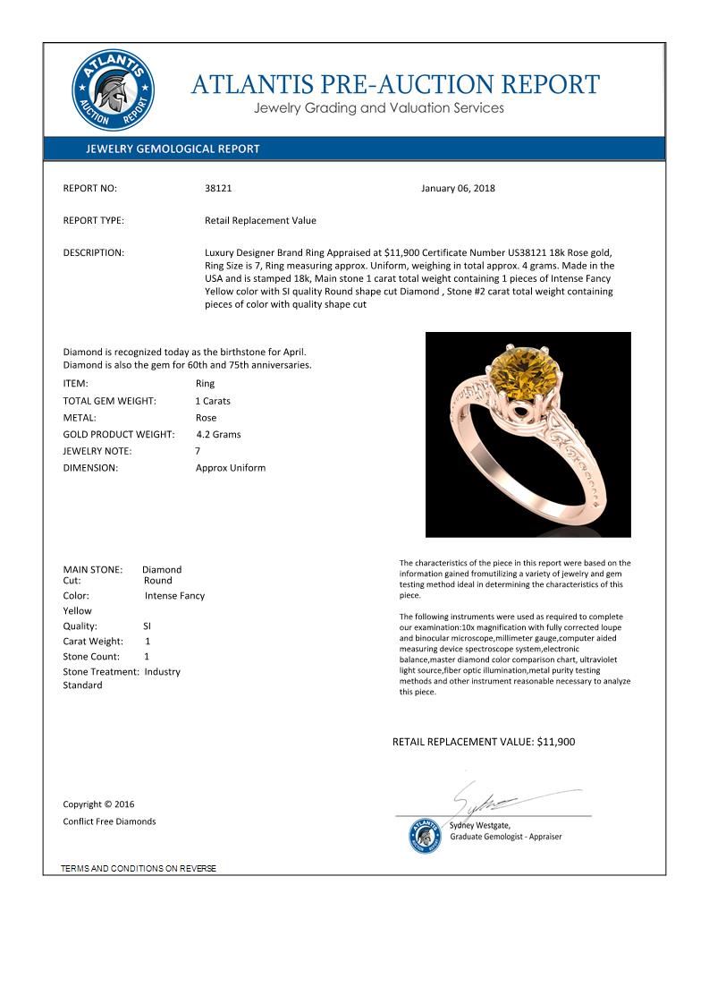 REF-180F2N -38121 ---- 1 CTW Intense Yellow Diamond Solitaire Engagement Art Deco Ring 18K Rose Gold ---- Luxury Designer Brand Ring Appraised at $11,900 Certificate Number US38121 18k Rose gold, Ring Size is 7, Ring measuring approx. Uniform, weighing in total approx. 4 grams. Made in the USA and is stamped 18k, Main stone 1 carat total weight containing 1 pieces of Intense Fancy Yellow color with SI quality Round shape cut Diamond , Stone #2 carat total weight containing pieces of color with quality shape cut