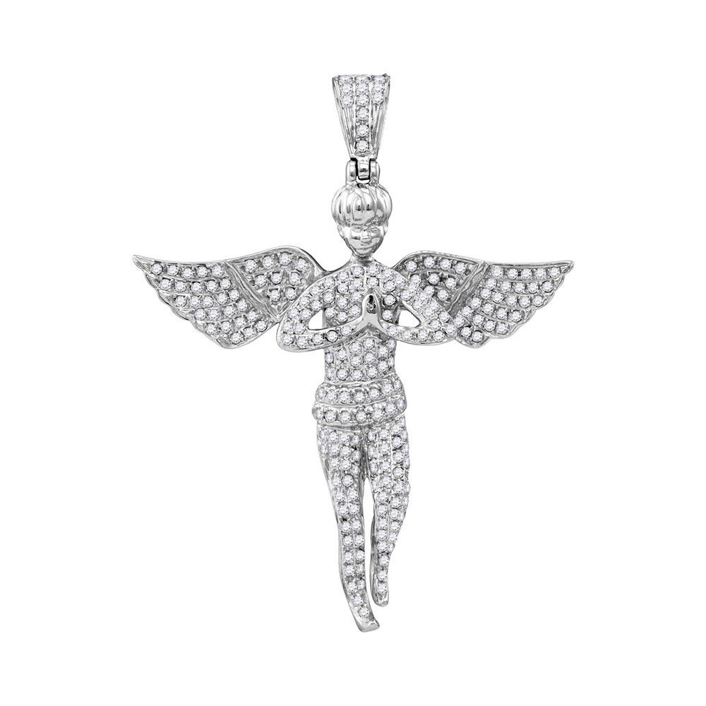 REF-47K9R ---- 1 CTW Mens Round Diamond Angel Wings Religious Charm Pendant 10kt White Gold