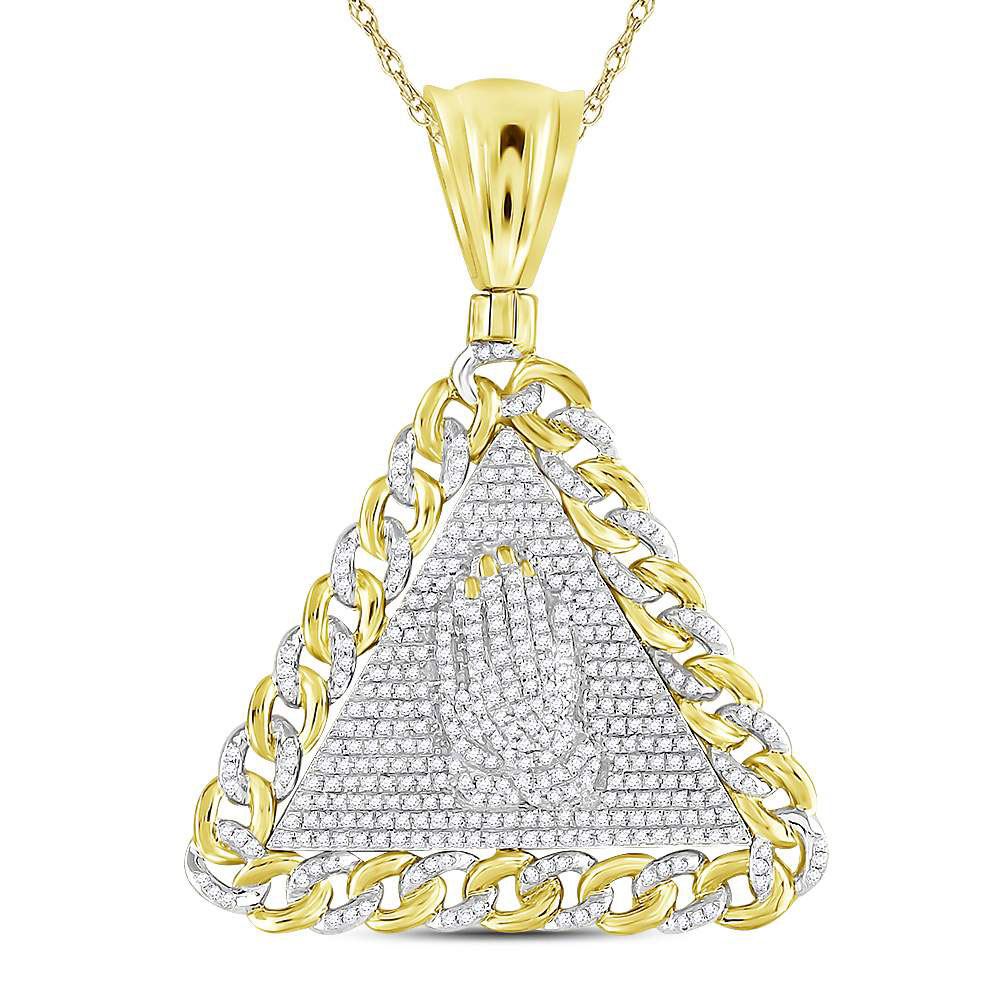 REF-115F8W - 1 CTW Mens Round Diamond Praying Hands Triangle Charm Pendant 10kt Yellow Gold - REF-115F8W