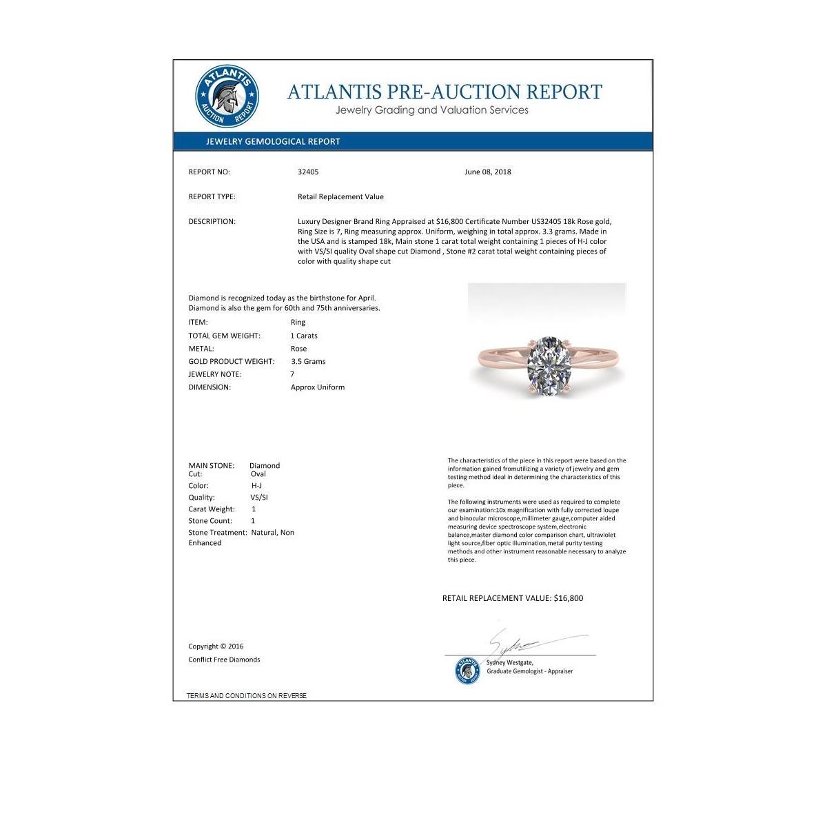 REF-280K3W -32405 ---- 1 CTW Oval Cut VS/SI Diamond Engagement Designer Ring 18K Rose Gold ---- Luxury Designer Brand Ring Appraised at $16,800 Certificate Number US32405 18k Rose gold, Ring Size is 7, Ring measuring approx. Uniform, weighing in total approx. 3.3 grams. Made in the USA and is stamped 18k, Main stone 1 carat total weight containing 1 pieces of H-J color with VS/SI quality Oval shape cut Diamond , Stone #2 carat total weight containing pieces of color with quality shape cut