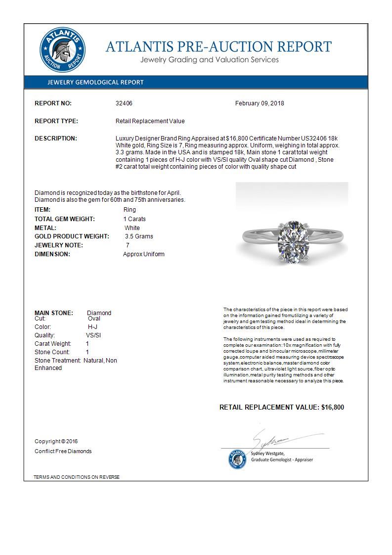 REF-280M3H -32406 ---- 1 CTW Oval Cut VS/SI Diamond Engagement Designer Ring 18K White Gold ---- Luxury Designer Brand Ring Appraised at $16,800 Certificate Number US32406 18k White gold, Ring Size is 7, Ring measuring approx. Uniform, weighing in total approx. 3.3 grams. Made in the USA and is stamped 18k, Main stone 1 carat total weight containing 1 pieces of H-J color with VS/SI quality Oval shape cut Diamond , Stone #2 carat total weight containing pieces of color with quality shape cut