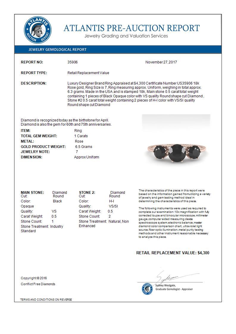 35906 - REF-71A3V ---- 1 CTW Past Present Future Black Certified Diamond Ring 18K Rose Gold ---- Luxury Designer Brand Ring Appraised at $4,300 Certificate Number US35906 18k Rose gold, Ring Size is 7, Ring measuring approx. Uniform, weighing in total approx. 6.3 grams. Made in the USA and is stamped 18k, Main stone 0.5 carat total weight containing 1 pieces of Black Opaque color with VS quality Round shape cut Diamond , Stone #2 0.5 carat total weight containing 2 pieces of H-I color with VS/SI quality Round shape cut Diamond