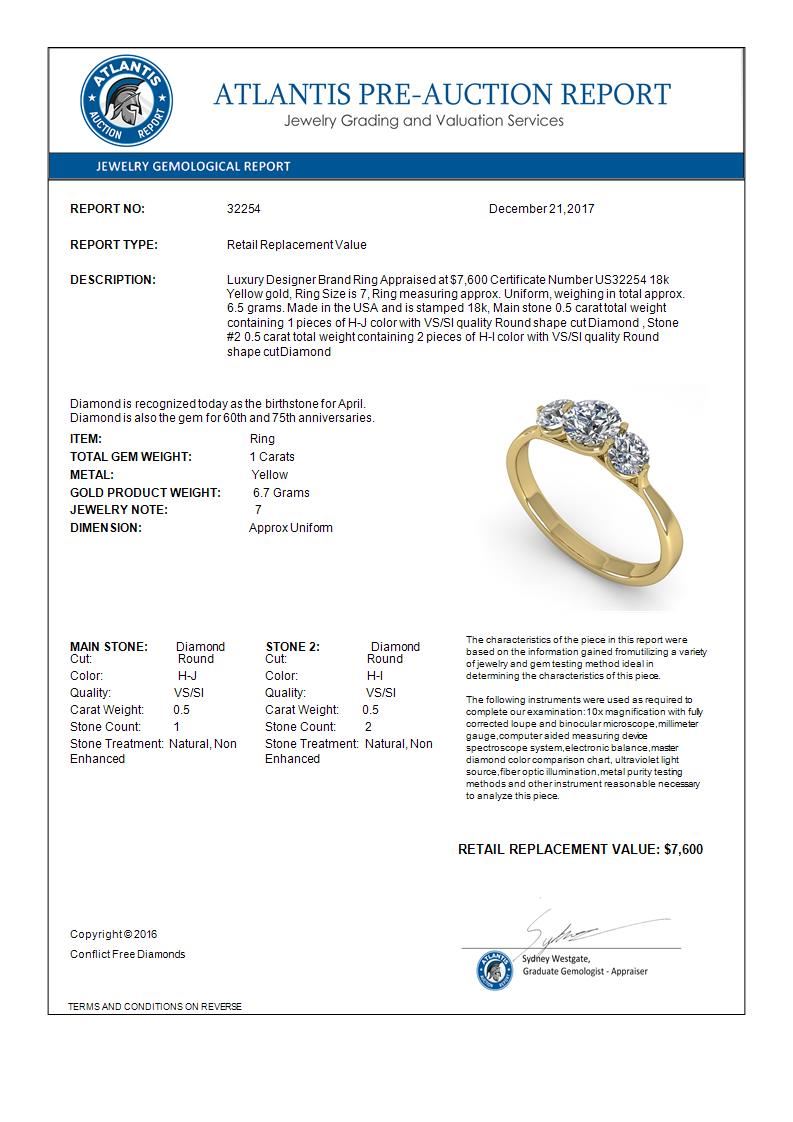 REF-153A8X -32254 ---- 1 CTW Past Present Future Certified VS/SI Diamond Ring Martini 18K Yellow Gold ---- Luxury Designer Brand Ring Appraised at $7,600 Certificate Number US32254 18k Yellow gold, Ring Size is 7, Ring measuring approx. Uniform, weighing in total approx. 6.5 grams. Made in the USA and is stamped 18k, Main stone 0.5 carat total weight containing 1 pieces of H-J color with VS/SI quality Round shape cut Diamond , Stone #2 0.5 carat total weight containing 2 pieces of H-I color with VS/SI quality Round shape cut Diamond