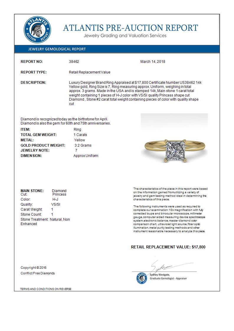 REF-297M2H -38462 ---- 1 CTW Princess Cut VS/SI Diamond Engagement Designer Ring 14K Yellow Gold ---- Luxury Designer Brand Ring Appraised at $17,800 Certificate Number US38462 14k Yellow gold, Ring Size is 7, Ring measuring approx. Uniform, weighing in total approx. 3 grams. Made in the USA and is stamped 14k, Main stone 1 carat total weight containing 1 pieces of H-J color with VS/SI quality Princess shape cut Diamond , Stone #2 carat total weight containing pieces of color with quality shape cut