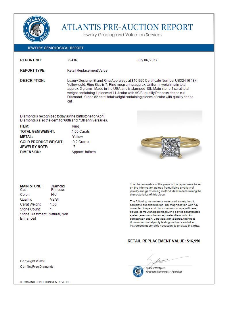 1 CTW Princess Cut VS/SI Diamond Engagement Designer Ring 18K Yellow Gold ---- Luxury Designer Brand Ring Appraised Retail Price at $16,950 ---- SKU Number US32416 18k Yellow gold Ring Size is 7, Ring measuring approx. Uniform, weighing in total approx. 3 grams. Made in the USA and is stamped 18k, Main stone 1.00 carat total weight containing 1 pieces of H-J color with VS/SI quality Princess shape cut Diamond , Stone #2 carat total weight containing pieces of color with quality shape cut