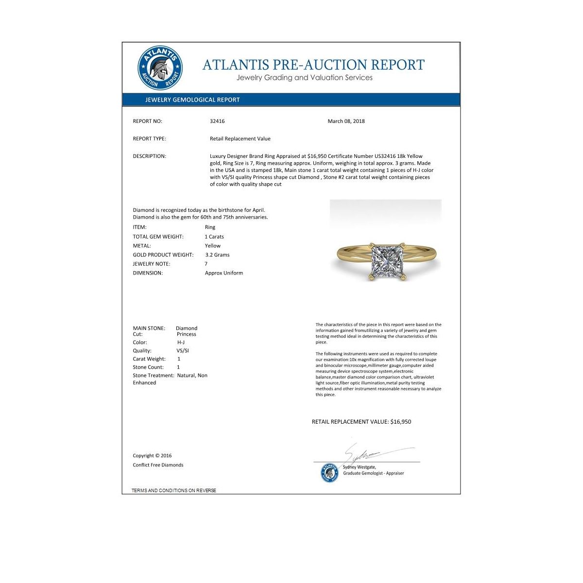 REF-282X2T -32416 ---- 1 CTW Princess Cut VS/SI Diamond Engagement Designer Ring 18K Yellow Gold ---- Luxury Designer Brand Ring Appraised at $16,950 Certificate Number US32416 18k Yellow gold, Ring Size is 7, Ring measuring approx. Uniform, weighing in total approx. 3 grams. Made in the USA and is stamped 18k, Main stone 1 carat total weight containing 1 pieces of H-J color with VS/SI quality Princess shape cut Diamond , Stone #2 carat total weight containing pieces of color with quality shape cut