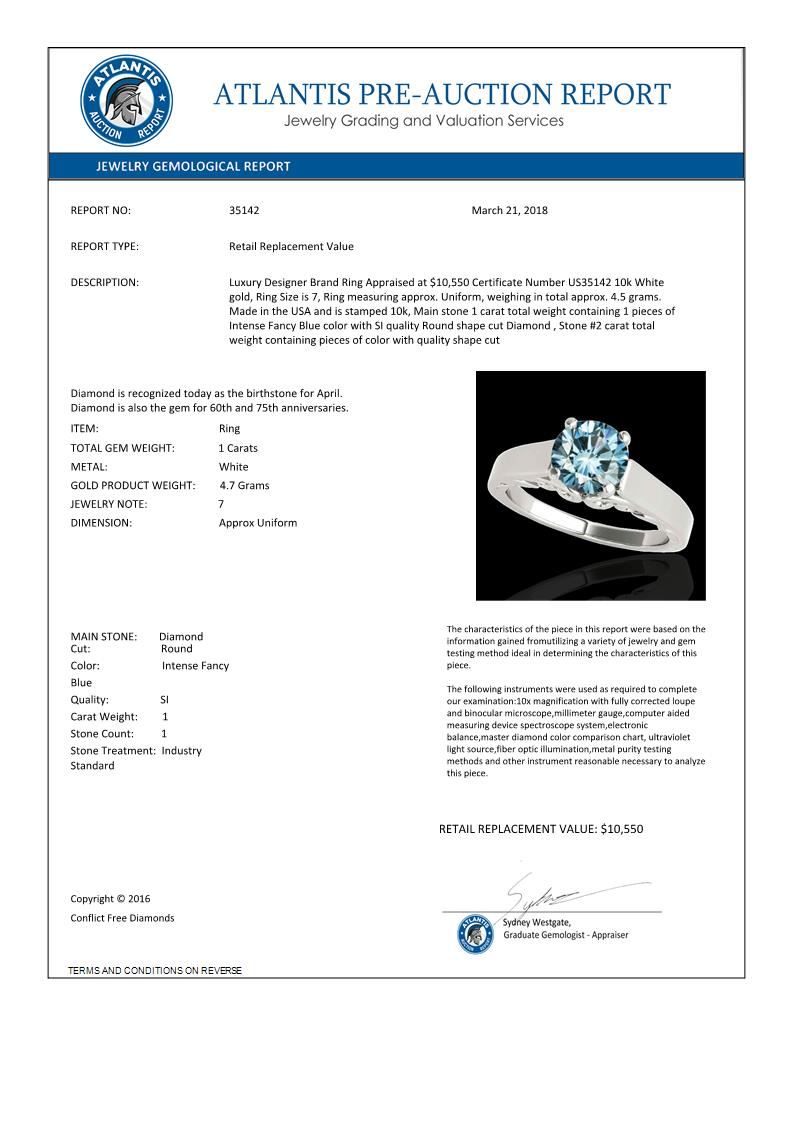 REF-160W2F -35142 ---- 1 CTW Si Certified Fancy Blue Diamond Solitaire Ring 10K White Gold ---- Luxury Designer Brand Ring Appraised at $10,550 Certificate Number US35142 10k White gold, Ring Size is 7, Ring measuring approx. Uniform, weighing in total approx. 4.5 grams. Made in the USA and is stamped 10k, Main stone 1 carat total weight containing 1 pieces of Intense Fancy Blue color with SI quality Round shape cut Diamond , Stone #2 carat total weight containing pieces of color with quality shape cut