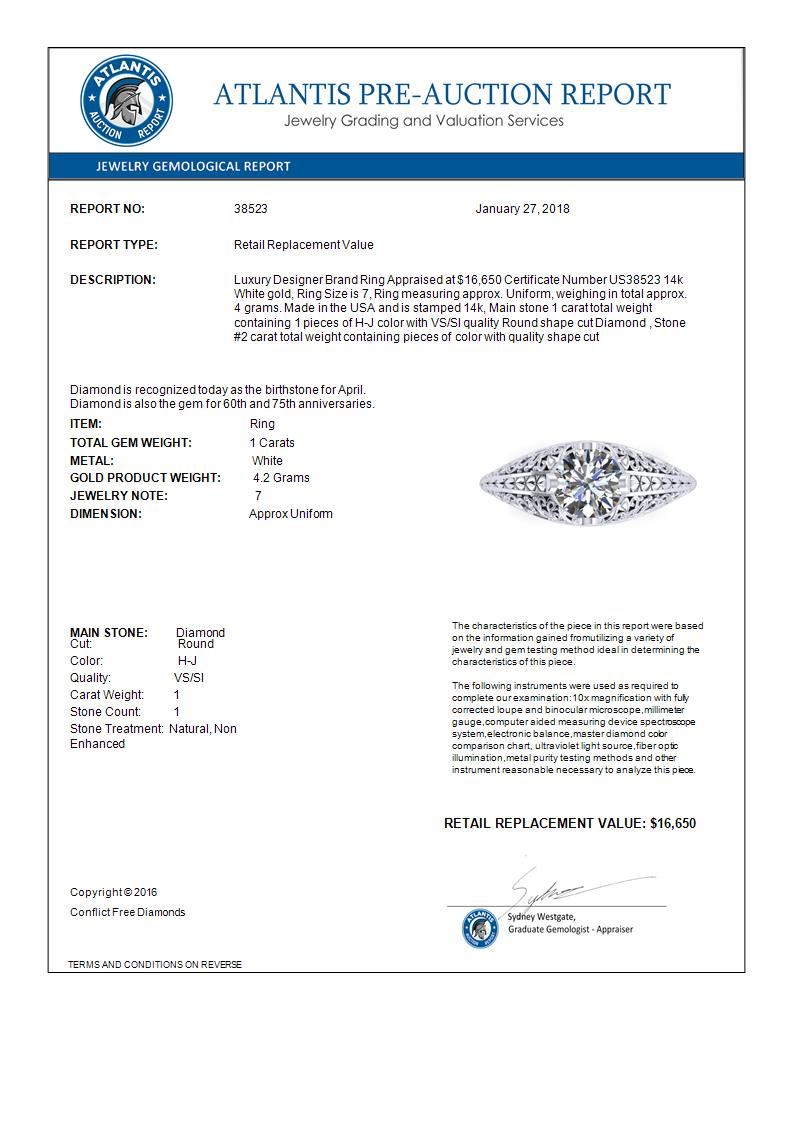 REF-277X2T -38523 ---- 1 CTW Solitaire Certified VS/SI Diamond Ring 14K White Gold ---- Luxury Designer Brand Ring Appraised at $16,650 Certificate Number US38523 14k White gold, Ring Size is 7, Ring measuring approx. Uniform, weighing in total approx. 4 grams. Made in the USA and is stamped 14k, Main stone 1 carat total weight containing 1 pieces of H-J color with VS/SI quality Round shape cut Diamond , Stone #2 carat total weight containing pieces of color with quality shape cut