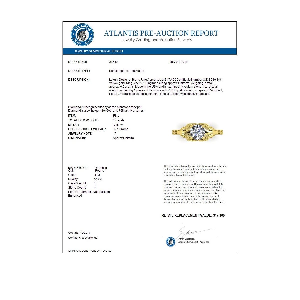 REF-289F6N -38540 ---- 1 CTW Solitaire Certified VS/SI Diamond Ring 14K Yellow Gold ---- Luxury Designer Brand Ring Appraised at $17,400 Certificate Number US38540 14k Yellow gold, Ring Size is 7, Ring measuring approx. Uniform, weighing in total approx. 6.5 grams. Made in the USA and is stamped 14k, Main stone 1 carat total weight containing 1 pieces of H-J color with VS/SI quality Round shape cut Diamond , Stone #2 carat total weight containing pieces of color with quality shape cut