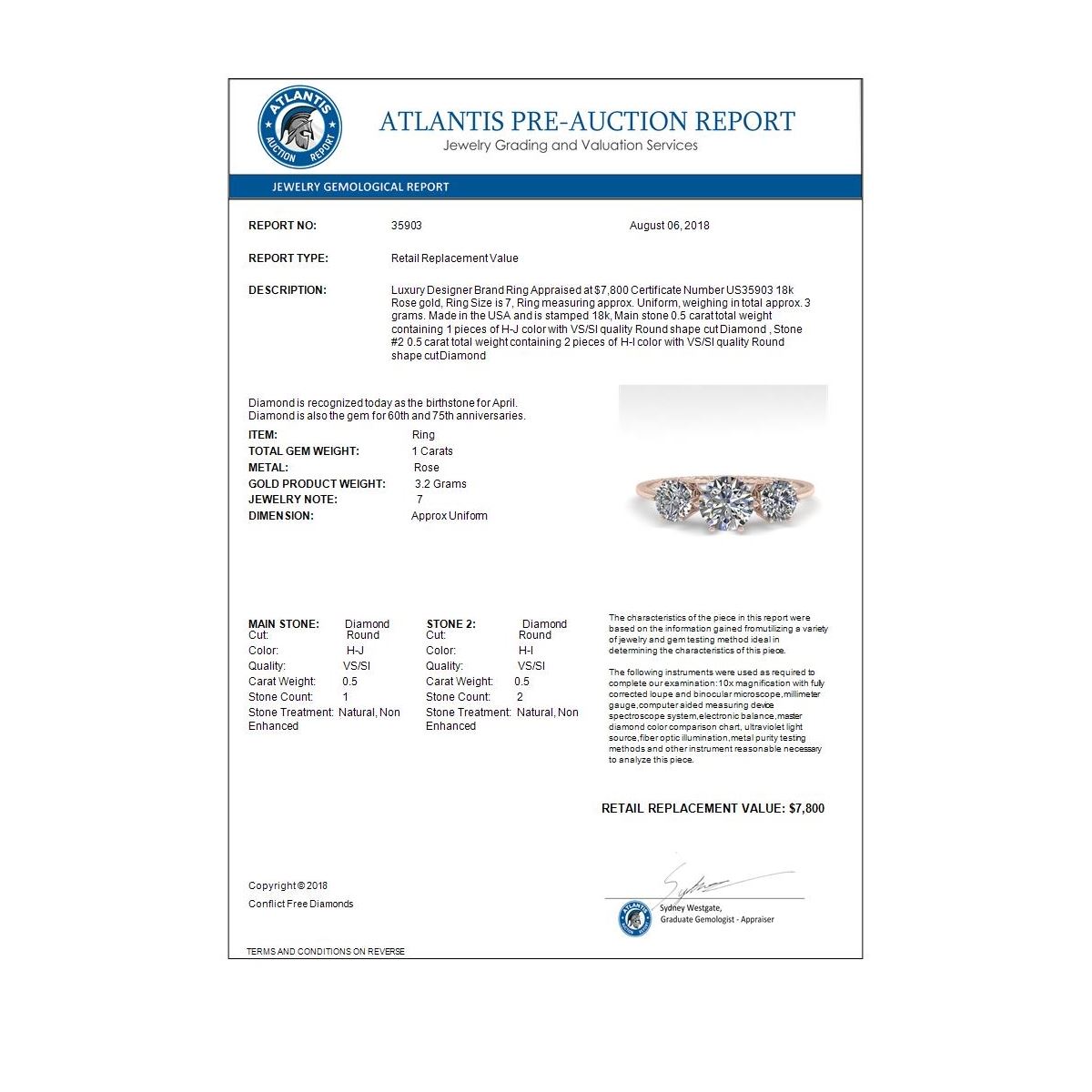REF-157F5N -35903 ---- 1 CTW Solitaire Past Present Future VS/SI Diamond Ring 18K Rose Gold ---- Luxury Designer Brand Ring Appraised at $7,800 Certificate Number US35903 18k Rose gold, Ring Size is 7, Ring measuring approx. Uniform, weighing in total approx. 3 grams. Made in the USA and is stamped 18k, Main stone 0.5 carat total weight containing 1 pieces of H-J color with VS/SI quality Round shape cut Diamond , Stone #2 0.5 carat total weight containing 2 pieces of H-I color with VS/SI quality Round shape cut Diamond