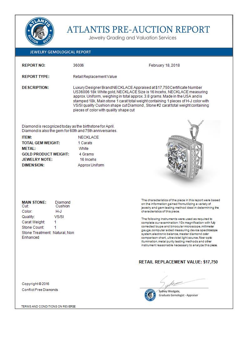REF-332W8F -36006 ---- 1 CTW VS/SI Cushion Cut Diamond Solitaire Necklace 18K White Gold ---- Luxury Designer Brand NECKLACE Appraised at $17,750 Certificate Number US36006 18k White gold, NECKLACE Size is 16 Incehs, NECKLACE measuring approx. Uniform, weighing in total approx. 3.8 grams. Made in the USA and is stamped 18k, Main stone 1 carat total weight containing 1 pieces of H-J color with VS/SI quality Cushion shape cut Diamond , Stone #2 carat total weight containing pieces of color with quality shape cut