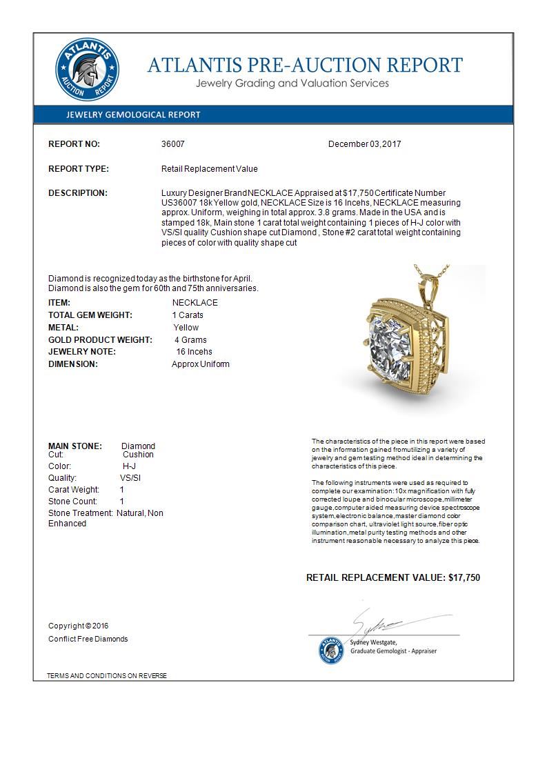 REF-332T8M -36007 ---- 1 CTW VS/SI Cushion Cut Diamond Solitaire Necklace 18K Yellow Gold ---- Luxury Designer Brand NECKLACE Appraised at $17,750 Certificate Number US36007 18k Yellow gold, NECKLACE Size is 16 Incehs, NECKLACE measuring approx. Uniform, weighing in total approx. 3.8 grams. Made in the USA and is stamped 18k, Main stone 1 carat total weight containing 1 pieces of H-J color with VS/SI quality Cushion shape cut Diamond , Stone #2 carat total weight containing pieces of color with quality shape cut