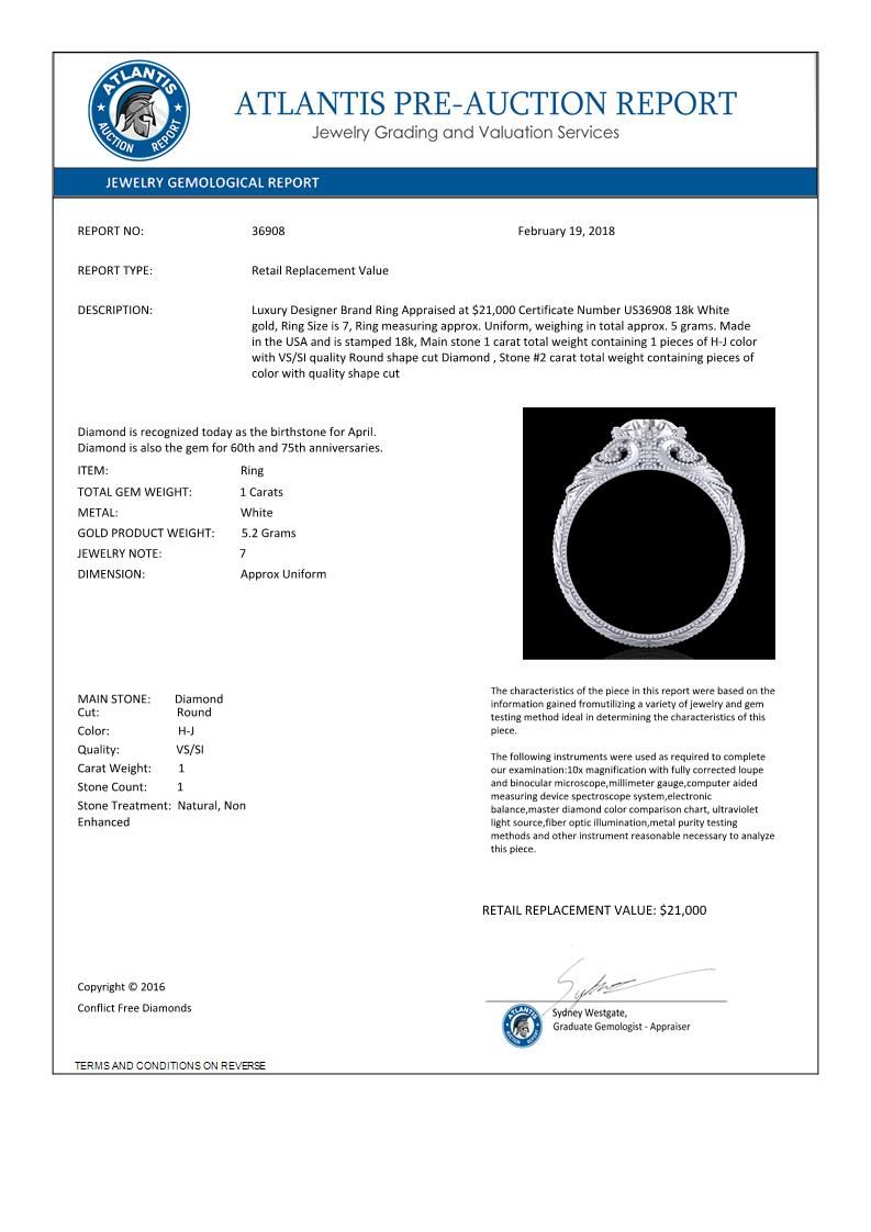REF-315M2H -36908 ---- 1 CTW VS/SI Diamond Solitaire Art Deco Ring 18K White Gold ---- Luxury Designer Brand Ring Appraised at $21,000 Certificate Number US36908 18k White gold, Ring Size is 7, Ring measuring approx. Uniform, weighing in total approx. 5 grams. Made in the USA and is stamped 18k, Main stone 1 carat total weight containing 1 pieces of H-J color with VS/SI quality Round shape cut Diamond , Stone #2 carat total weight containing pieces of color with quality shape cut