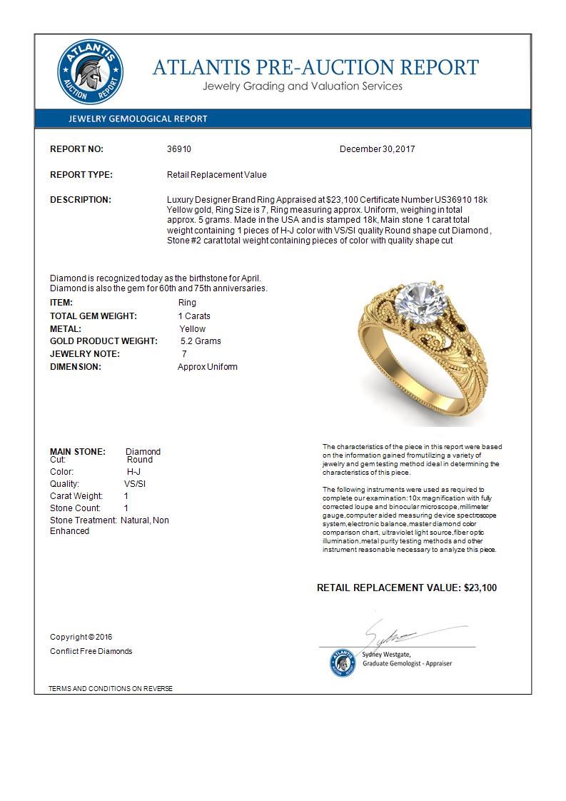 REF-315W2F -36910 ---- 1 CTW VS/SI Diamond Solitaire Art Deco Ring 18K Yellow Gold ---- Luxury Designer Brand Ring Appraised at $23,100 Certificate Number US36910 18k Yellow gold, Ring Size is 7, Ring measuring approx. Uniform, weighing in total approx. 5 grams. Made in the USA and is stamped 18k, Main stone 1 carat total weight containing 1 pieces of H-J color with VS/SI quality Round shape cut Diamond , Stone #2 carat total weight containing pieces of color with quality shape cut
