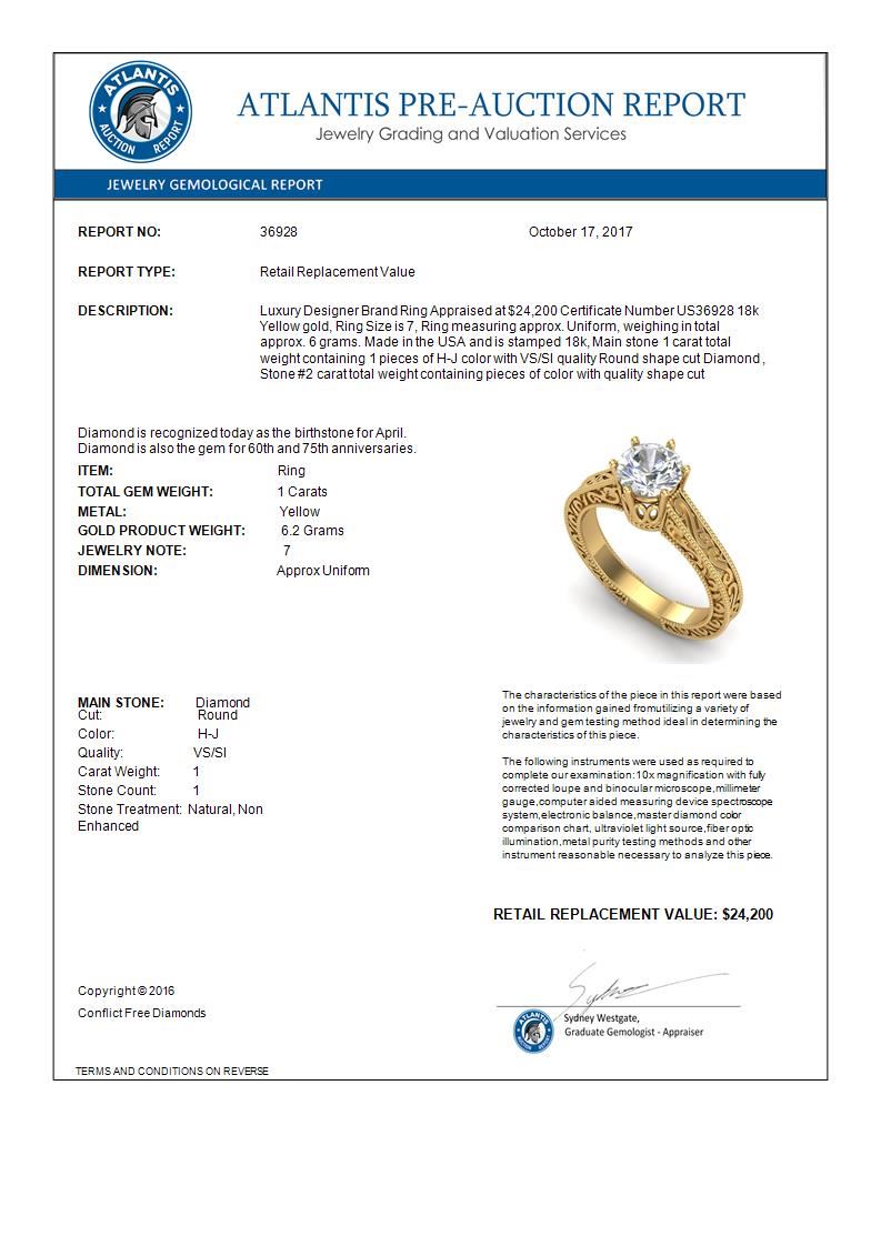 36928 - REF-330X2R ---- 1 CTW VS/SI Diamond Solitaire Art Deco Ring 18K Yellow Gold ---- Luxury Designer Brand Ring Appraised at $24,200 Certificate Number US36928 18k Yellow gold, Ring Size is 7, Ring measuring approx. Uniform, weighing in total approx. 6 grams. Made in the USA and is stamped 18k, Main stone 1 carat total weight containing 1 pieces of H-J color with VS/SI quality Round shape cut Diamond , Stone #2 carat total weight containing pieces of color with quality shape cut