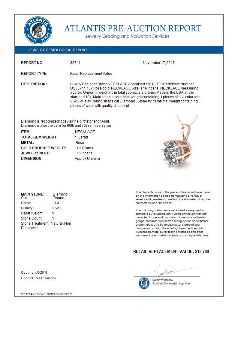 REF-280N2Y -35711 ---- 1 CTW VS/SI Diamond Solitaire Necklace 18K Rose Gold ---- Luxury Designer Brand NECKLACE Appraised at $18,700 Certificate Number US35711 18k Rose gold, NECKLACE Size is 16 Incehs, NECKLACE measuring approx. Uniform, weighing in total approx. 2.9 grams. Made in the USA and is stamped 18k, Main stone 1 carat total weight containing 1 pieces of H-J color with VS/SI quality Round shape cut Diamond , Stone #2 carat total weight containing pieces of color with quality shape cut